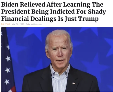 The indictment has the added benefit of taking the focus off the House Republicans’ investigation of the Biden family’s alleged foreign influence peddling scheme and even lesser issues such as calls for the public release of the “manifesto” written by the transgender murderer who gunned down six people at The Covenant School in Nashville this week. - Elizabeth Stauffer, PowerLine, 1 April 2023.